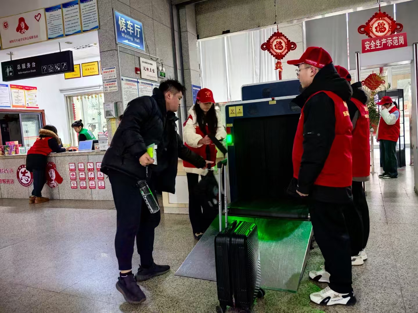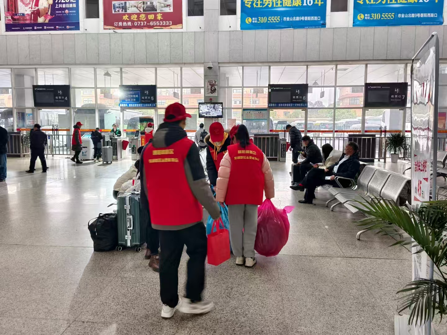 2月6日上午9點(diǎn),朝陽(yáng)汽車站候車大廳隨處可見(jiàn)身穿紅馬甲的志愿者。他們?cè)谑燮贝翱凇矙z通道、進(jìn)出站口等人流密集區(qū)域,熱心為旅客提供購(gòu)票引導(dǎo)、行李搬運(yùn)、咨詢解答等服務(wù)。
